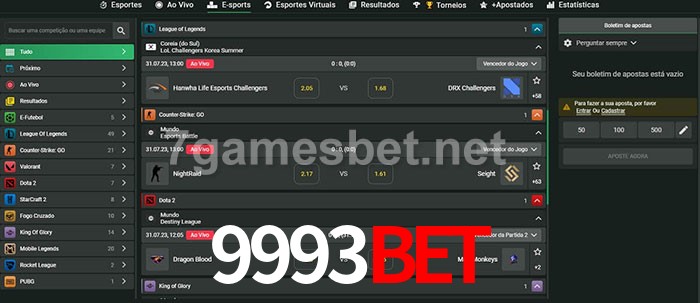 O 9993Bet oferece uma grande seleção de opções de apostas em e-sports com probabilidades competitivas